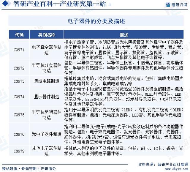 电子器件是指在真空、气体或固体中,利用和控制电子运动规律而制成的器件。根据《中华人民共和国国民经济行业分类(GB/T 4754-2017)》,电子器件制造分为电子真空器件制造、半导体分立器件制造、集成电路制造、显示器件制造、半导体照明器件制造、光电子器件制造、其他电子器件制造等行业。